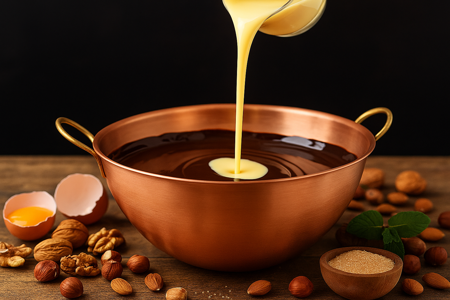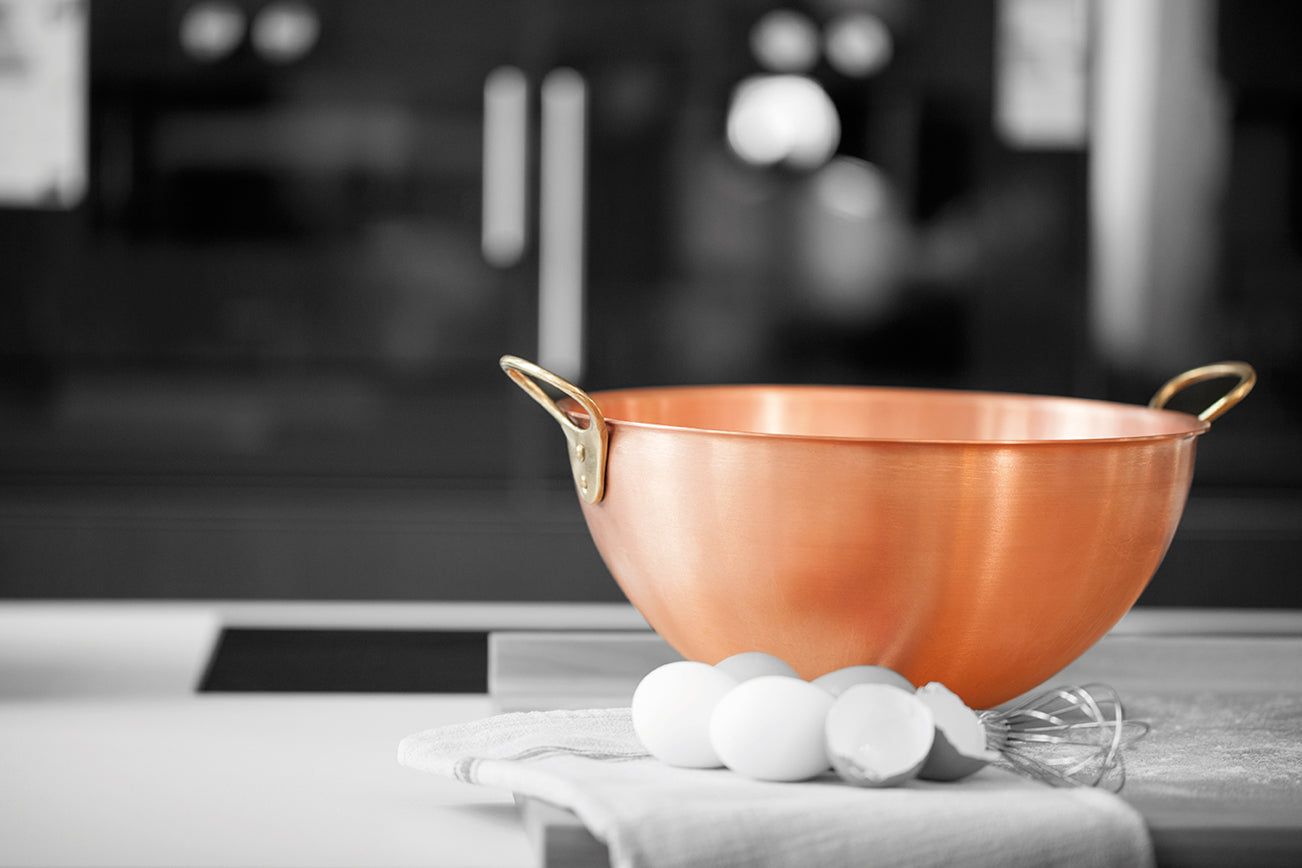 Produktmerkmale: Hergestellt aus reinem Kupfer, das nicht nur durch seine gute Wärmeleitfähigkeit bekannt ist, besonders bei der Herstellung von Süßspeisen und Desserts hat Kupfer herausragende Eigenschaften z.B. schmecken Eierspeisen die in Kupfer vorbereitet und hinterher gebraten oder gebacken werden deutlich weniger "schweflig". Baiser und Biskuit haben deshalb weniger Eigeschmack. Diese geschmacklichen Einflüsse sind nicht nur subjektiv erfahrbar, sondern beruhen sich auf chemische und physikalische Reaktionen des Kupfers auf Lebensmittel. So ist auch durch wiederholte Experimente bewiesen, das Eiklar das in einer Rührschüssel aus Kupfer aufgeschlagen wurde erhält einen stabileren Schaum.