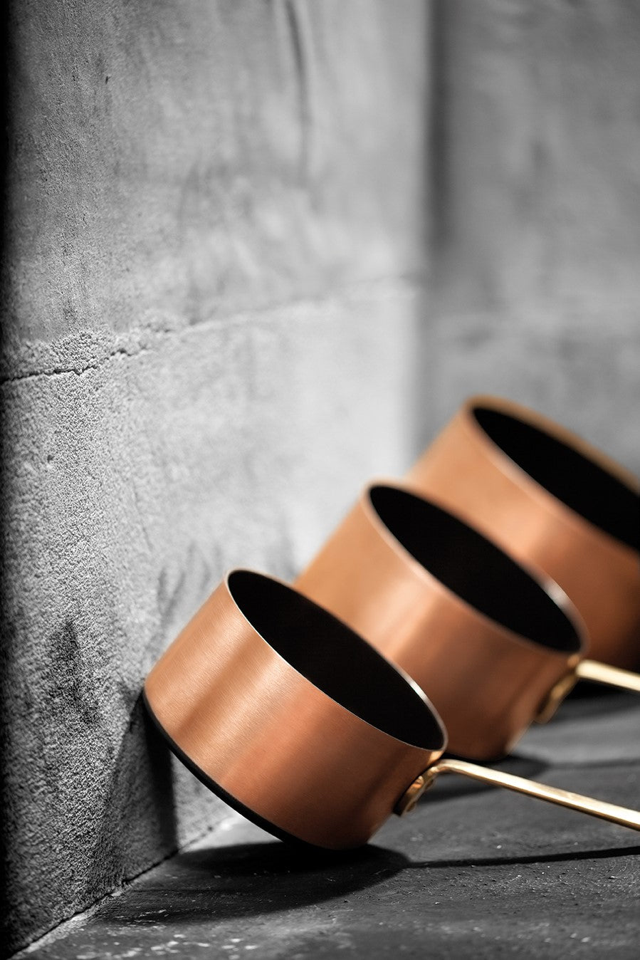Zeitlose Ästhetik: Der warme Goldton des Messings bildet einen eleganten Kontrast zum rötlichen Schimmer des Kupfers. Mit der Zeit wird dieses Ensemble eine einzigartige, edle Patina entwickeln, die die Geschichte Ihrer kulinarischen Leidenschaft erzählt.