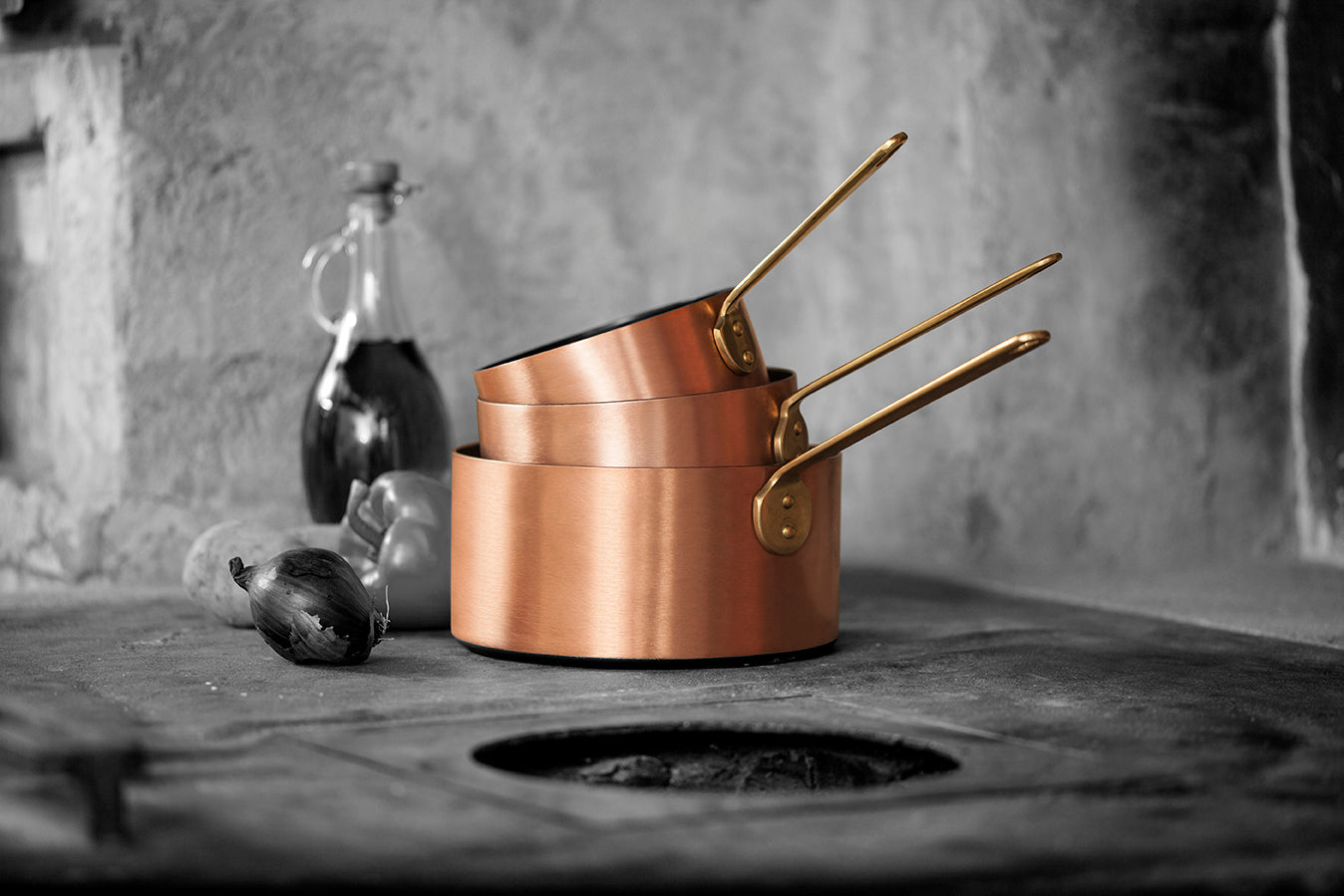 Zeitlose Ästhetik: Der warme Goldton des Messings bildet einen eleganten Kontrast zum rötlichen Schimmer des Kupfers. Mit der Zeit wird dieses Ensemble eine einzigartige, edle Patina entwickeln, die die Geschichte Ihrer kulinarischen Leidenschaft erzählt.